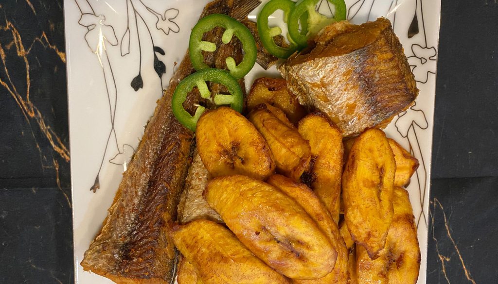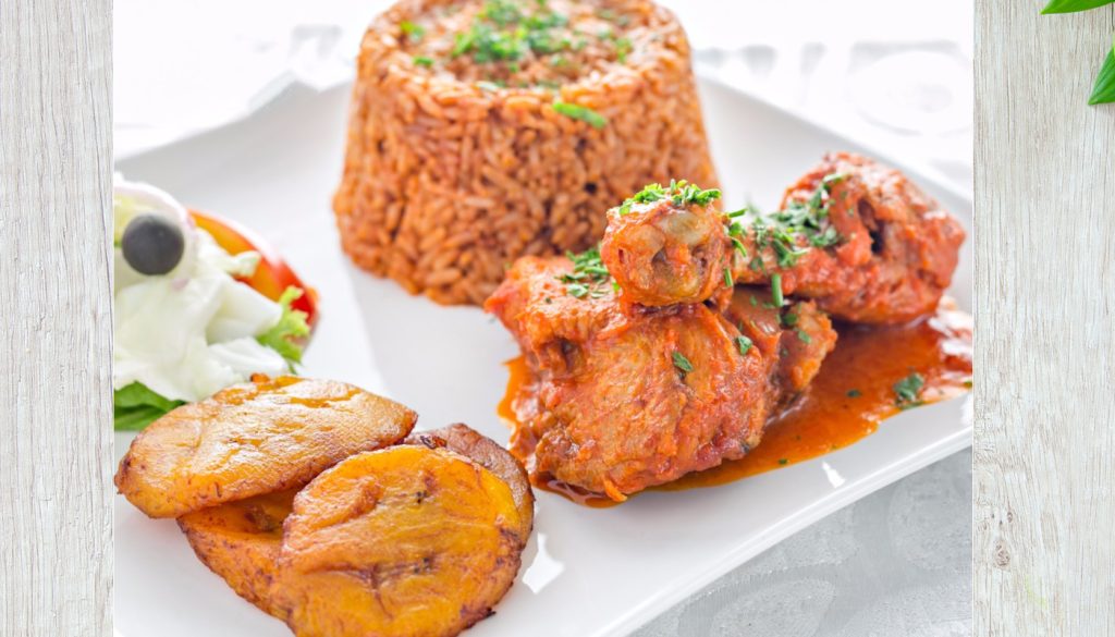Joli of Rice, spinach or mixed veggies , fried plantains and any protein of your choice, Chicken, Beef or Fish